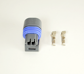 2-pin female Weatherpack connector. Sold as shown with case, pins and rubber seals.
