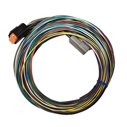 26-pin connector harness for the PE3 series engine control unit. Consists of 26-pin fully populated ECU end connector that terminates in bare wire at the opposite end. Color coded and striped wires. Includes 4-pin comm connector pigtail. 6' long, unterminated. Data Sheet